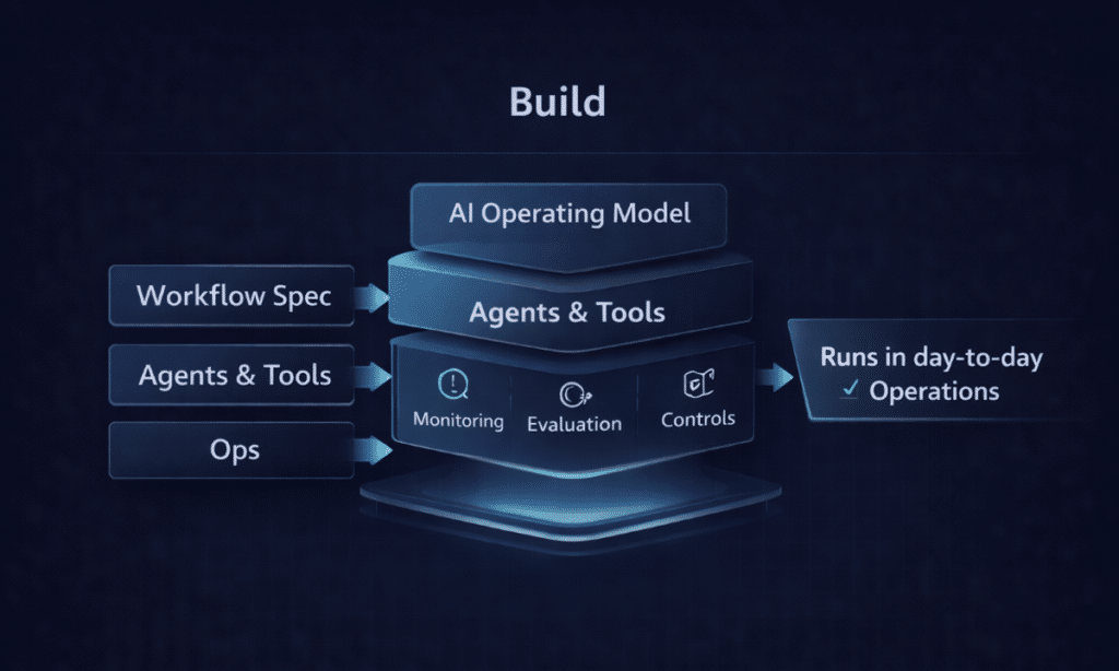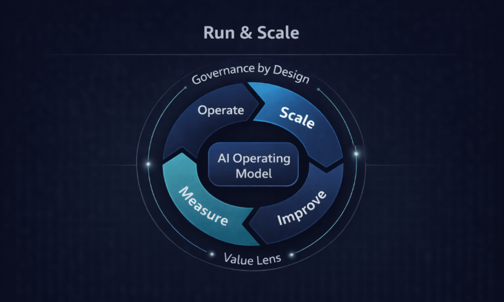 Run & Scale ensures that processes, data flows and accountabilities are continuously refined so your AI operating model creates more value with every iteration instead of eroding over time.